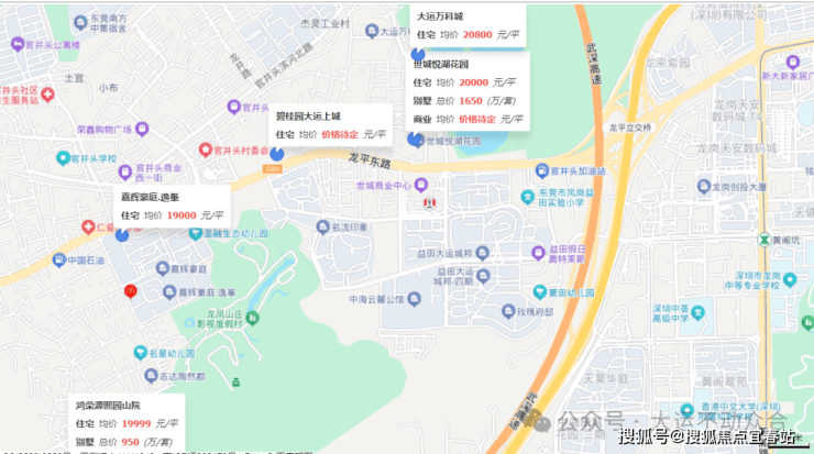 从卫星图看,大运城邦与龙岗中心城一路之隔,有龙平西路和清林路直通龙岗中心城。项目分八期,配套有东北师大附属益田小学、幼儿园,旁边还有待建学校,教育资源完善。此外,还有商业益田假日天地等,旁边是楼面价2.76万的中海地王。