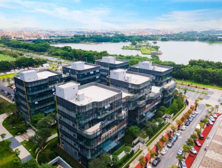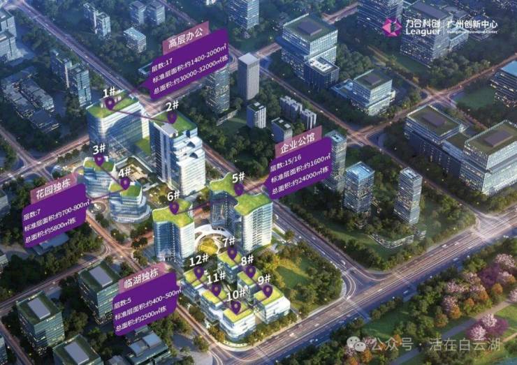 项目位于广州市白云湖数字科技城启动区,计容建筑面积约13.5万平方米,由12栋单体组成,含括临湖独栋、企业公馆、高层办公、花园独栋等多种建筑形态。