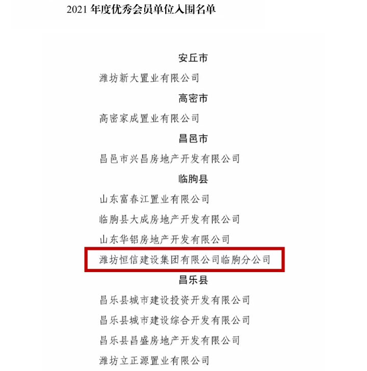 随着企业的不断进步,恒信集团的业务范围也在不断拓宽。如今的恒信,已根植不同的城市,尊重和理解每一方土地、人文、市场和客户。匠心努力之下,不仅恒信集团总部荣获多项荣誉,分公司也紧随步伐。本月,临朐分公司在2021年度全市房地产业协会发展中作出突出贡献被评为“潍坊市房地产业协会优秀会员单位”。这一年,临朐恒信集团实现了5年来较高销售业绩,全年签约18.8亿,共销售2015套商品房,市场占有率达到43%,成为当地龙头房企。