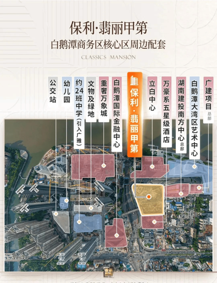 这一地块地处白鹅潭商务区核心区,三江交汇处,周边商业、交通、人文、教育、医疗配套一应俱全,在建的双重奢商业地标——广州万象城、聚龙湾太古里,未来必将为白鹅潭带来非凡体验。