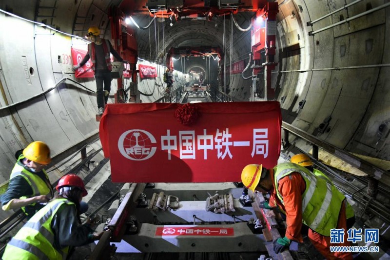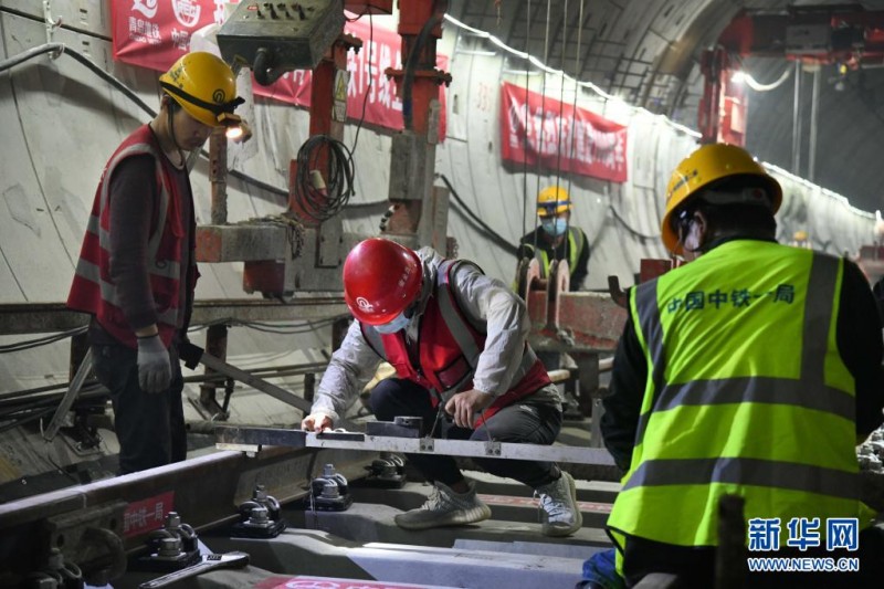 注:5月19日,现场工作人员在进行最后两段钢轨施工。新华社记者李紫恒摄