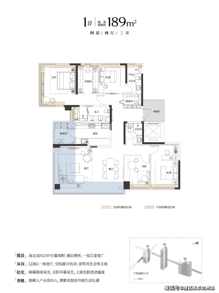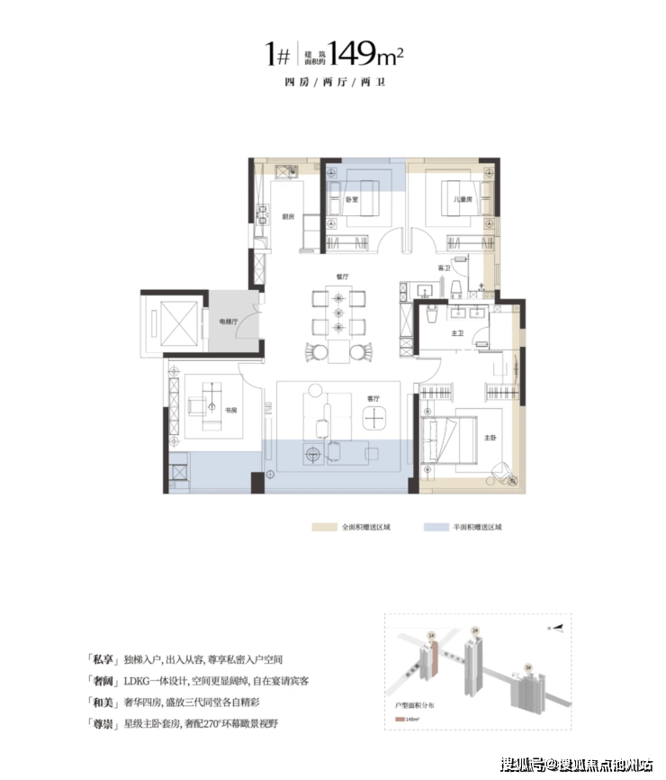 该户型为1号楼高层西边户,和建面约153㎡整体布局一致。
