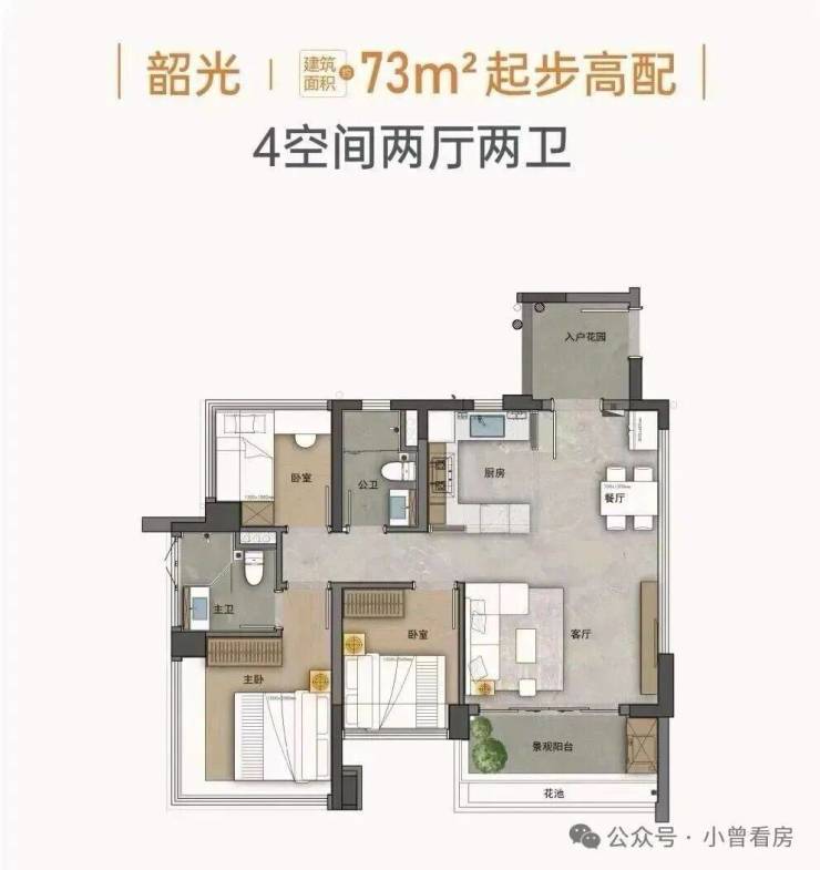 建面73平三房,带入户花园,LDKB一体化设计,客厅开间约4米。