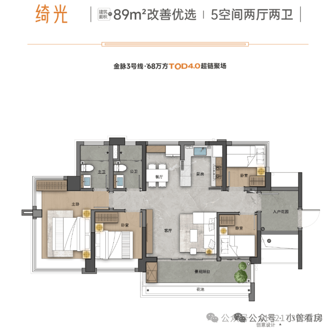 建面89平四房,该户型入户花园约12平,竖厅设计,约6.3米的宽景阳台链接了次卧,还能该做5房。