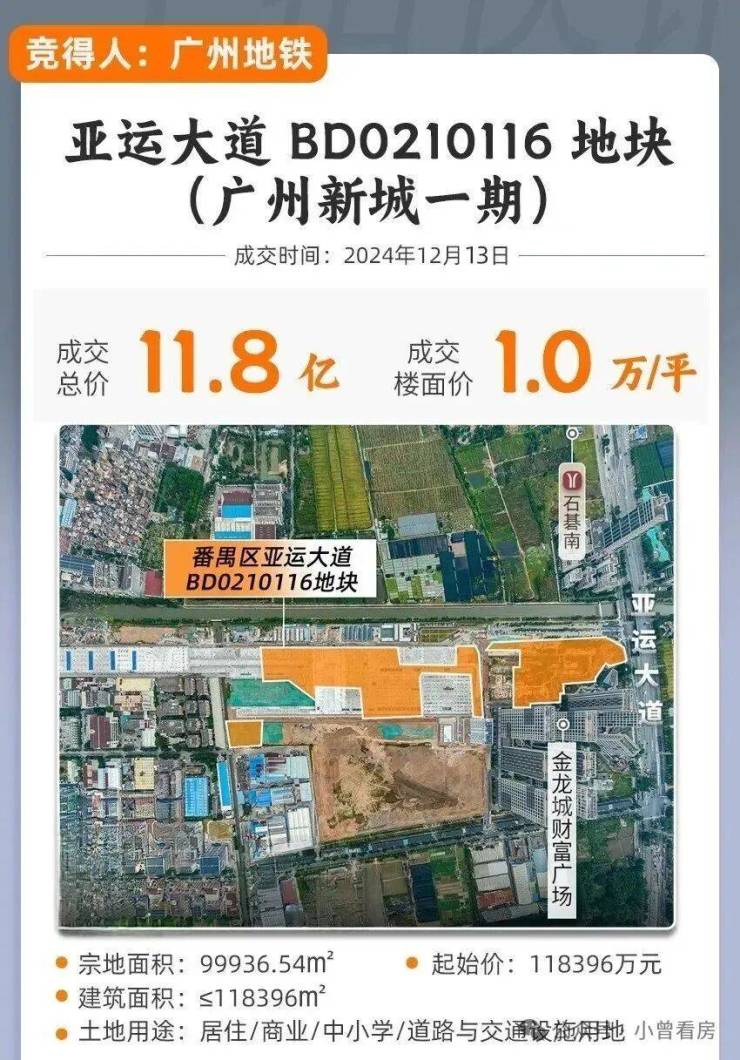 那么,大家还记得去年12月广州新城停车场一期地块(亚运大道BD0210116地块),被广州地铁地产以底价118396万拿下,折合单价1万一平。