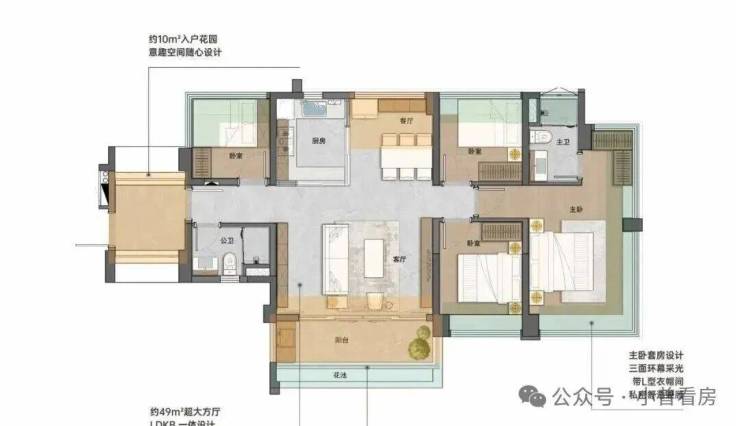 建面130平四房,LDKB大方厅,客厅就有57平,还做了双主套设计,豪宅的配置互不干扰。