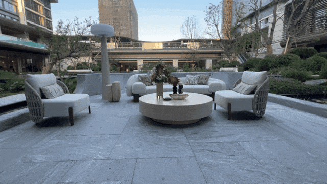 整体抬高的园林化作一座巨大的、脱离地面喧嚣的“空中花园”,如同悬浮于都市之上的“第三空间”,是专属的绿色净土。