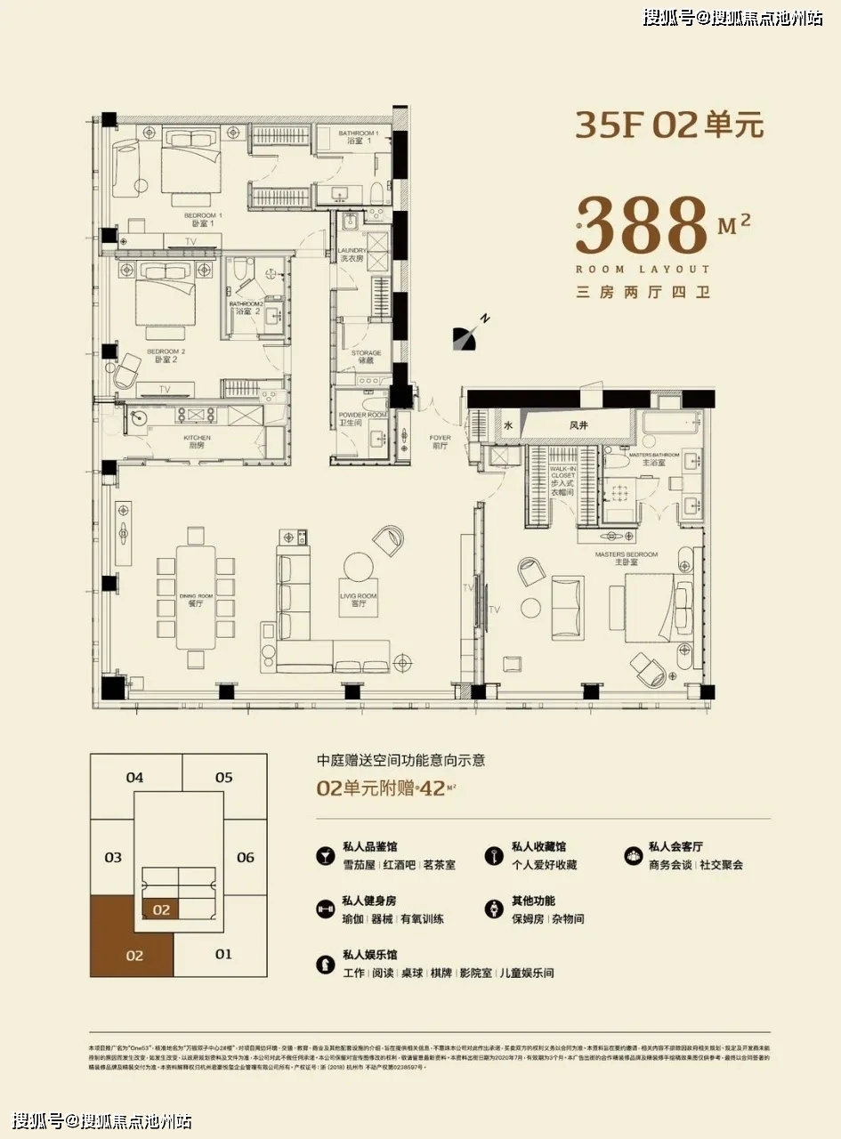 以样板房约418㎡四房两厅四卫户型为例,两侧的采光面宽,加在一起长达约38米。乘以层高,采光面积近180㎡,明媚到伤眼。