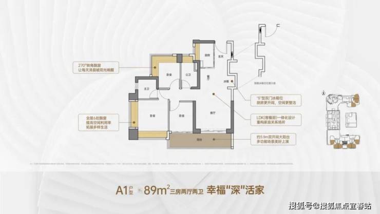 竖厅格局,客厅3.5米开间,LDKB一体化,S墙设计预留冰箱卡槽位,客厅连接次卧出5.9米长的大阳台,次卧270°转角飘窗,对比A1户型少一面飘窗,U型厨房,卫生间干湿分离。