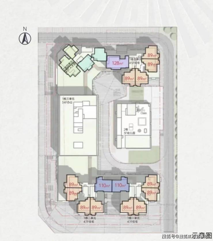 共由4栋总高44-47层的住宅+1栋34层的办公组成:其中,1栋1、2单元为47层住宅,5单元为45层住宅,约615套住宅(含50套回迁房);1栋4单元为41层人才房,共180套人才房;1栋3单元为34层写字楼;2栋规划为3层幼儿园。