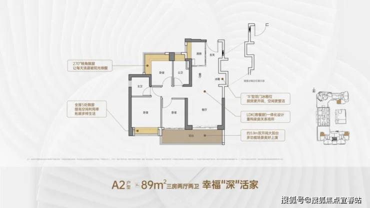 竖厅格局,客厅3.5米开间,LDKB一体化,S墙设计预留冰箱卡槽位,客厅连接次卧出5.9米长的大阳台,主卧双面飘窗,次卧270°转角飘窗,全屋6面飘窗,U型厨房,卫生间干湿分离。