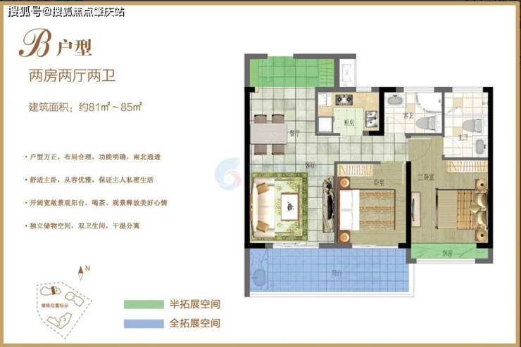 2# 楼在售户型:B 户型 85.36㎡两房两厅两卫;A 型 87.71㎡三房两厅。