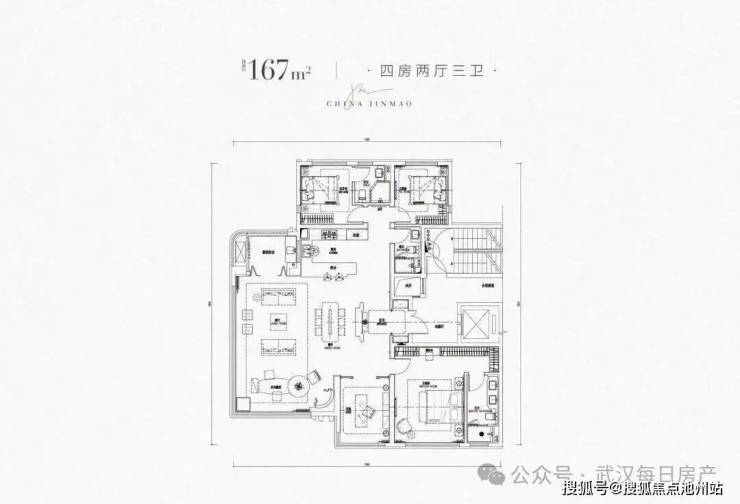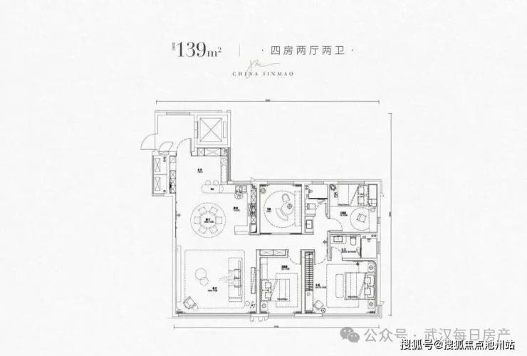 南向四开间朝南,采光面更大。这个户型的最大亮点在于客厅为真正的270度全景舱布局,北面还搭配了生活阳台,这个设计在武汉还是相当少见的