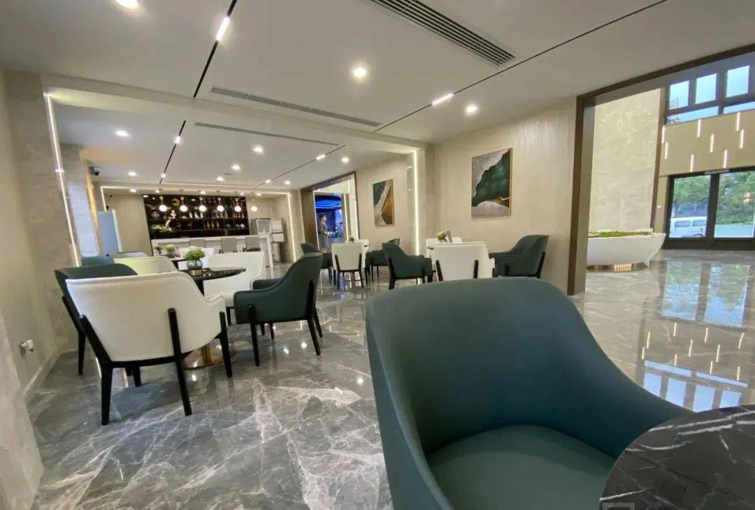 建筑外观上是新中式格调,以黑色面瓦为黛顶,整体线条简洁明快。