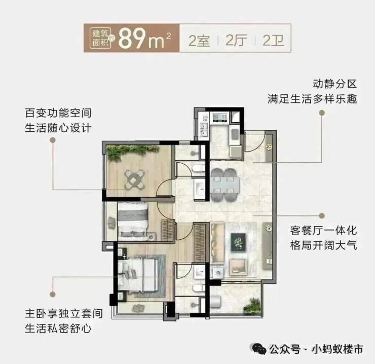 1. 建面约89㎡"2+1"房两厅两卫