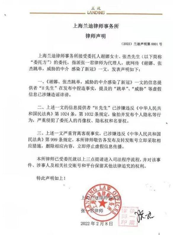 对于H显示的指控,张杰谢娜方予以否认,称H捏造事实,其提及的“跳单”、“威胁”等虚假信息已涉嫌造谣诽谤,并以侵犯隐私权、名誉权案由对上海雅銮房产及霍某某等人提起诉讼。