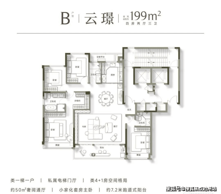 高层均为建面约199㎡的大平层户型,极致纯粹的业主圈层,带来更为尊贵的居住体验。其户型设计尽可能扩宽南向开间的同时,展现出了极为阔绰的空间尺度,足以满足多代同堂的居住需求,成为众多购房家庭终极改善的首选。
