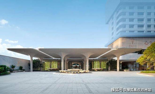 前场景观喷泉造型取自文冠花型(又名状元花),以玉曼米黄整石雕刻。地面铺装镌刻项目符号暗纹,嵌入铸铜细节,更添质感。