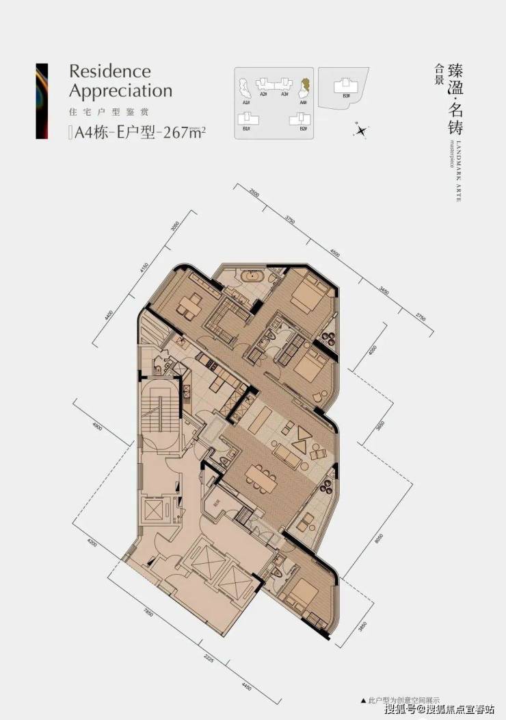 商业大平层有 322 平四房两厅五卫和 403 平四房两厅五卫两种户型,层高约 3.5 米,整体格局合理,动区空间充足。