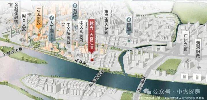 越秀·天荟江湾位于海珠区西南部,一线临珠江后航道,滨水而建,集景观公寓、街区商铺、大型商业综合体于一体的滨江综合体,将打造成为海珠南部的商业商务核心