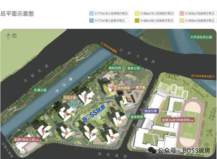 项目首推北组团1、9栋,也是最靠近兴业大道的两栋,首推面积从77、88、98、105平,后期还有更大的135平,产品设计使用率高达127-138%。