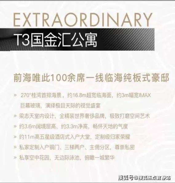 深圳恒裕国金汇(别名:恒裕前海金融中心、前海金融中心、景兴海上广场)是前海的一个商务综合体,由深圳市前海景兴商业服务有限公司开发,北京世邦魏理仕物业管理服务有限公司深圳分公司提供物业服务。项目包含写字楼、公寓和商业区。其中,T3为国金汇公寓,拥有海景资源,设计高端,提供尊享私密的生活空间,是前海地区的标志性建筑之一。