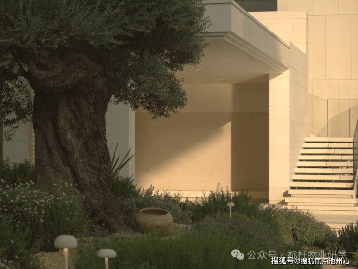 沿地下停车区步入下沉会所,私宴区、泳池区与瑜伽健身区环绕回香水庭与几何艺术绿谷。米色岛礁石、点景油橄榄与蔚蓝水韵光影交织,勾勒地中海浪情调。