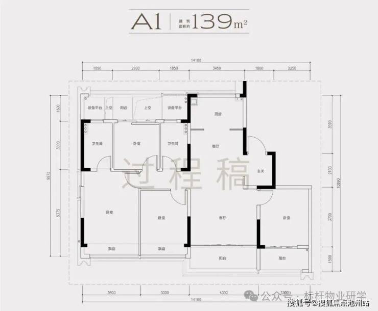 2)139方A1南厅户型,4房2厅2卫,得房率86%