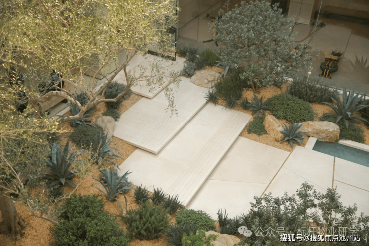 漂浮的海角花园自由延展,砾石花园与林台错落交融,树影与水光相映成趣。米白墙垣与古铜铝板的肌理在光影中呼吸,植物舒展的枝桠以舞蹈的姿态定格成永恒油画。