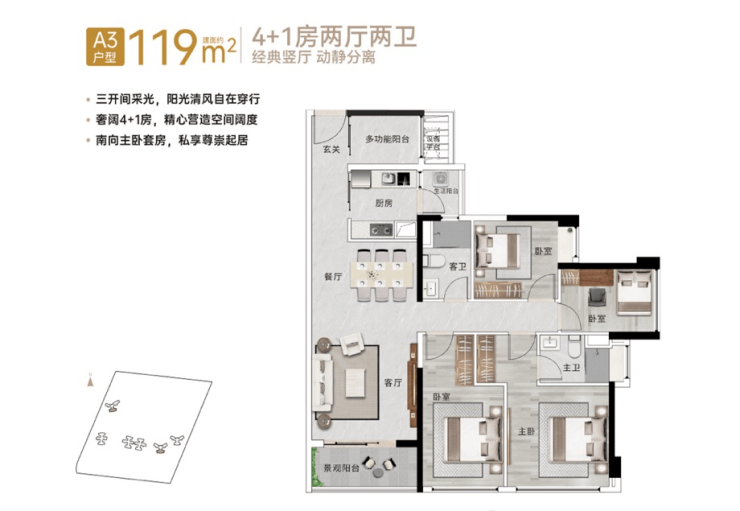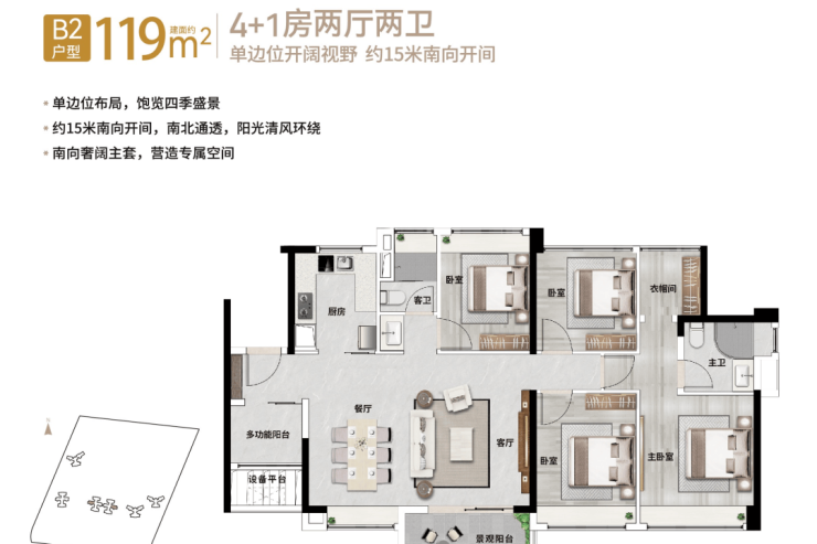 【119㎡4+1房2厅2卫】单边位布局,15米南向开间,南北通透