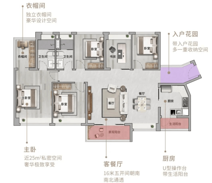 【140㎡5房2厅2卫】南北对流,约32m²阔绰客餐厅,约16米南向五开间,享央景园林约25m²豪华主卧,带独立衣帽间。