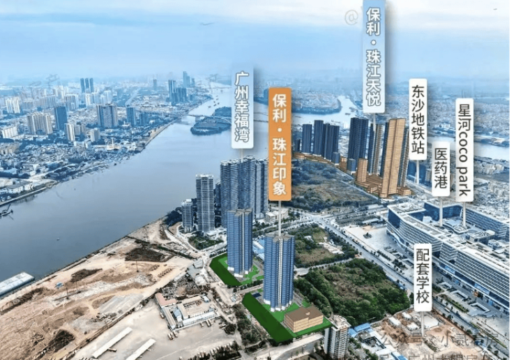 保利珠江印象与珠江天悦属于同一宗地块不同位置,是2023年12月,保利以总价约82.79亿拿下,珠江印象就在荔湾东沙北地块。