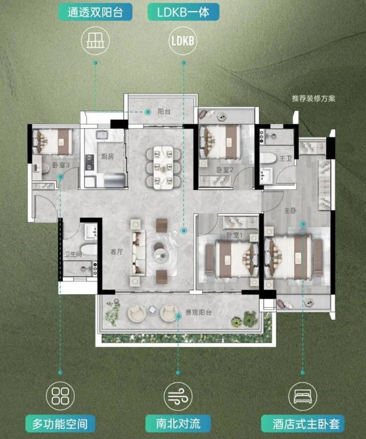建面约133㎡四房拥有超强可塑性,次卧可与客厅连通,打造约7.2米巨无霸客厅,北阳台可与厨餐合并改造,打造开放式餐厨,同样超7米南向大阳台、可改造的阔绰方厅,满足不同家庭的多元需求。