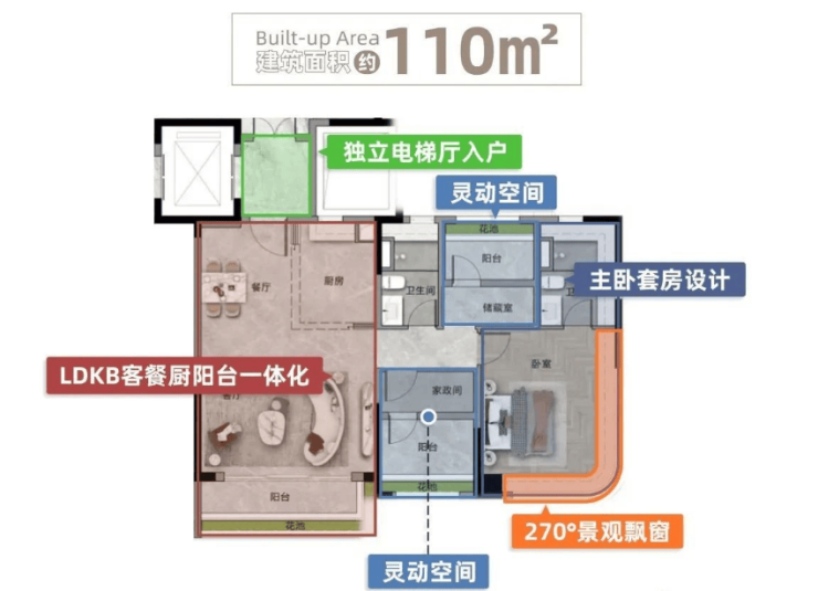 108-110㎡三房:LDK一体化设计,开放式厨房连接约8.9米南向双联阳台,主卧配置270度转角飘窗,采光面超12米。