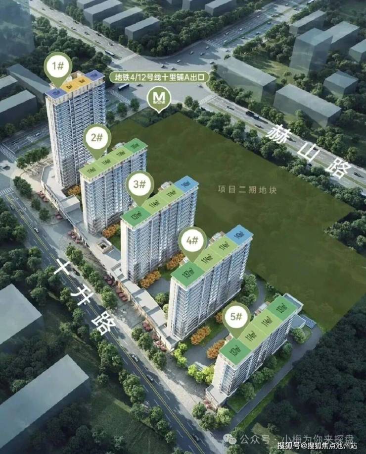 天创云和奕一期目前已经报规,因为项目地块狭长,项目的布局方式是沿着十升路由南到北一字排开的布局,带来的问题是所有楼栋都临街项目共规划为5栋11-26层的高层住宅+沿十升路分布有部分底商,住宅共计335户,户均面积116平,车位配比1:1.07,共计360个。