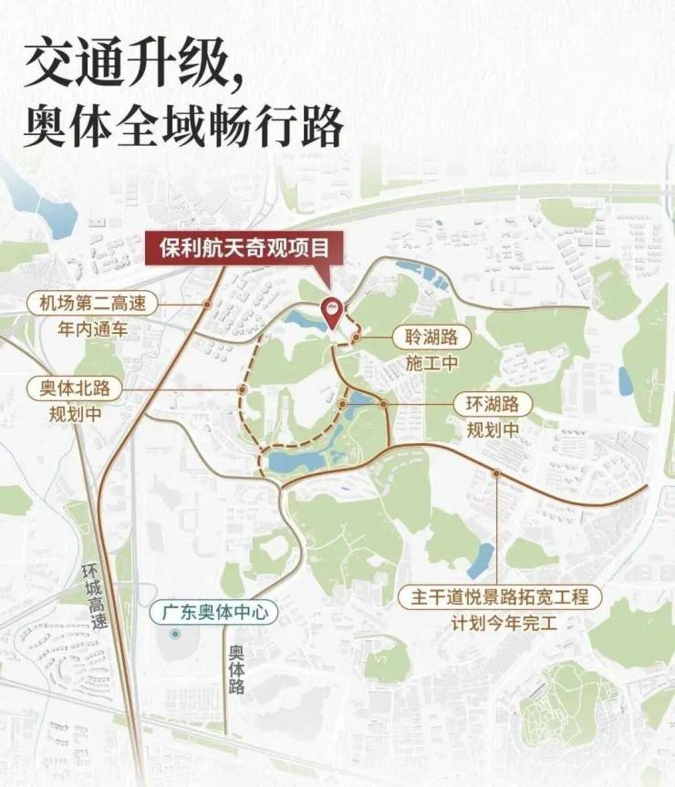 项目距离地铁21号线大观南路站1.4公里左右。自驾可通过大观街路直接接驳大观中路,周边还有沈海高速、环城高速和在建的机场第二高速等干线,自驾出行还算方便,不过高峰期大观路、合景路车流较多,经常会堵车。临湖路转悦景路再转奥体路。
