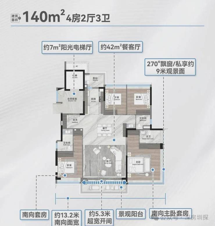 建面190平四房三卫,四开间朝南,9.4米观景阳台,客厅与次卧打通的话,客厅开间也可达9.4米,超43平的主卧,270度环幕飘窗,