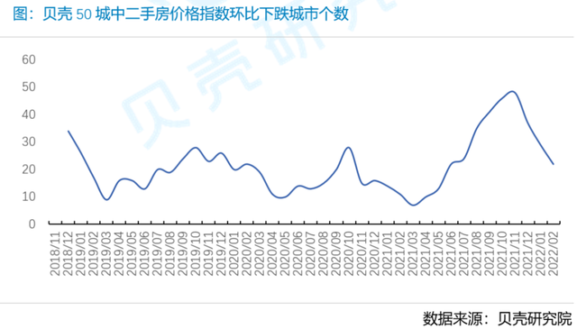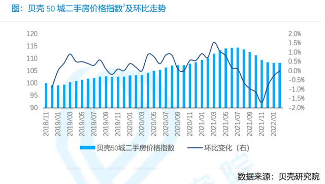 2月二手房价格环比止跌转稳。贝壳研究院数据显示,2022年2月贝壳50城二手房价格指数与1月持平,结束去年8月以来连续环比下跌的走势,下跌城市个数减少至22个。一线城市中北京、上海、广州保持小幅上涨,涨幅在1%以内;深圳结束去年8月以来连续6个月的环比下跌,转为小幅上涨。二三线城市中宁波、杭州、绍兴等城市本月环比止跌转涨;天津、徐州、常州等环比跌幅缩小。