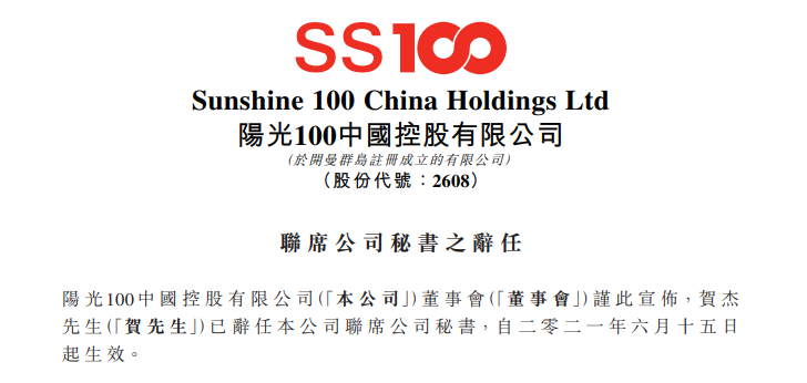 焦点财经讯 耿宸斐 6月15日晚间,阳光100中国控股有限公司(HK:02608)发布关于公司联席公司秘书辞任的公告。 根据公告,贺杰先生已辞任公司联席公司秘书,自2021年6月15日起生效。公司另一名联席公司秘书曾浩贤先生具备联交所证券上市规则第3.28条项下规定之必要资格及经验,将留任并担任公司