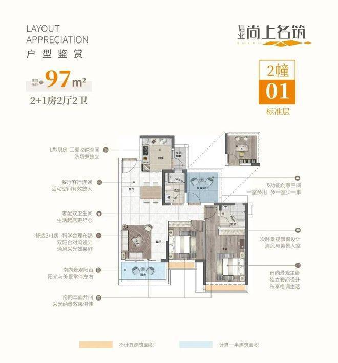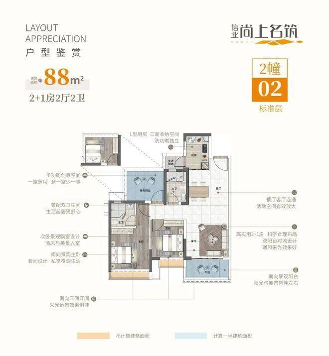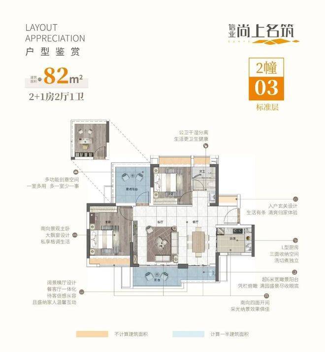片区少有高实用率N+1灵动户型,建筑面积约82-97㎡三房。以南向景观主流设计,同时考虑各功能分区合理运用,实现户型高增送弹性实用空间与南向景观最大化。