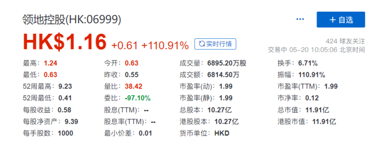 截至发稿,领地控股报1.16港元每股,涨110.91%。