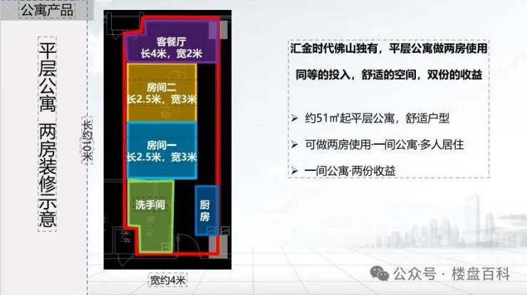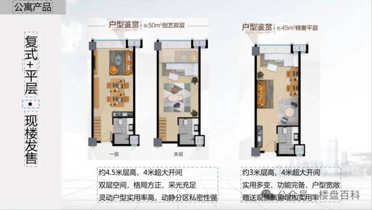 约46-108㎡起平层公寓,主要面积52-59方平层,户型方正舒适,采光通透;可做一房和两房使用,一间公寓多人居住,一间公寓多份收益,自住和投资皆可。