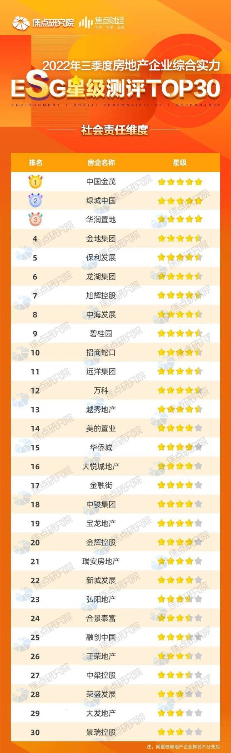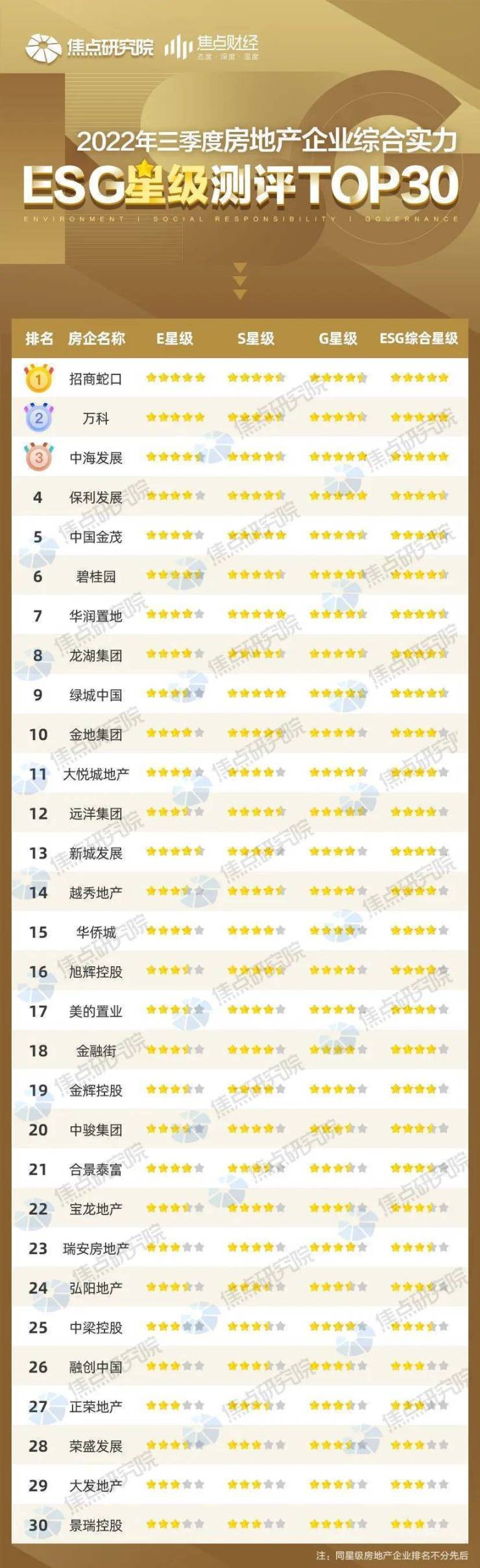 本测评为针对样本房地产企业2022年三季度ESG管理成果进行的综合星级测评。焦点研究院收集并整理了房地产企业官方网站信息、房地产企业公告及住房及城乡建设管理部门等政府部门数据,对环境资源维度(E)、社会责任维度(S)及公司治理维度(G)分别进行深入分析,最终形成2022年三季度房地产企业综合实力ESG星级测评TOP30榜单及三大维度榜单: