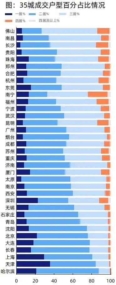 报告研究发现,35个城市中,两居室成为主力交易户型。以北京、上海为代表的一线城市,两居室成交占比较高。三居室成交户型百分占比紧随其后。济南市二居和三居户型占比相对较高,四居及以上户型占比较低。