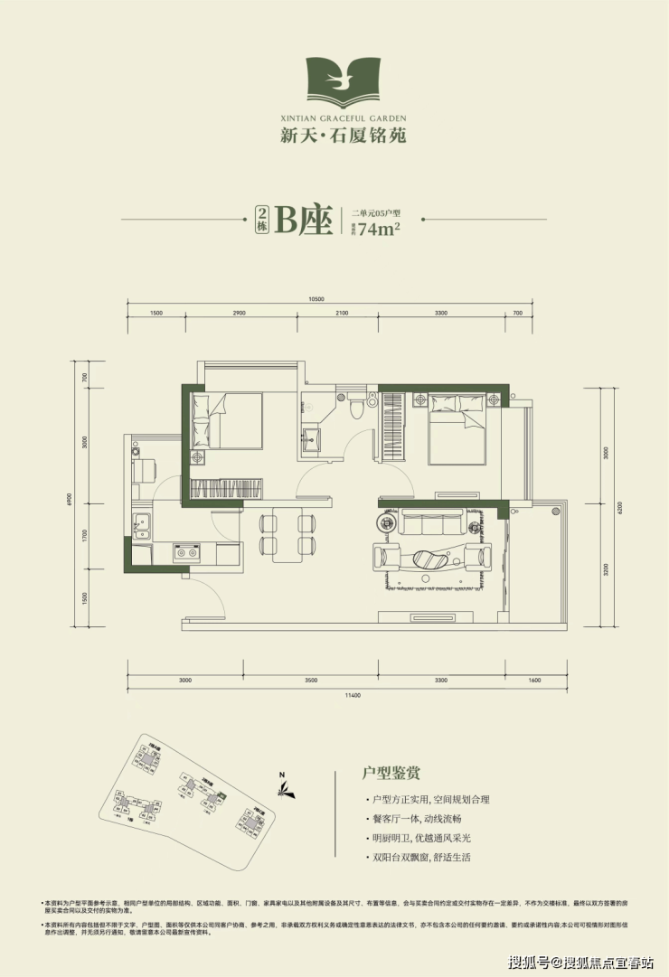 2栋B座二单元04、05户型:面积约为72-74㎡的2房2厅1卫。