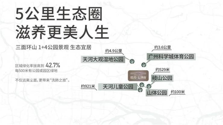 外揽“1+4公园”:山体公园、天河区儿童公园、岐山公园、天河大观湿地公园、广州科学城体育公园。