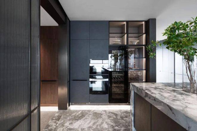 德国柏丽nobilia整体厨房,烤漆门板的选型为杭州壹号院量身定制,仿岩板色与深色木纹的搭配相得益彰,并加上柏丽的深色玻璃吊柜。