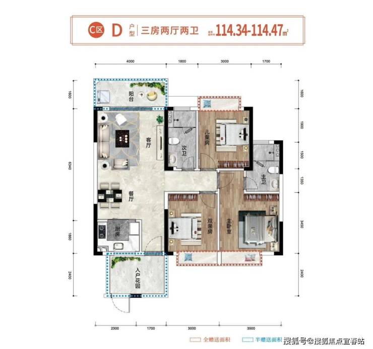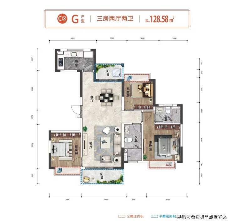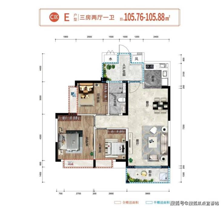 🏖𝐅户型约𝟭𝟬4㎡(三房两厅一卫)