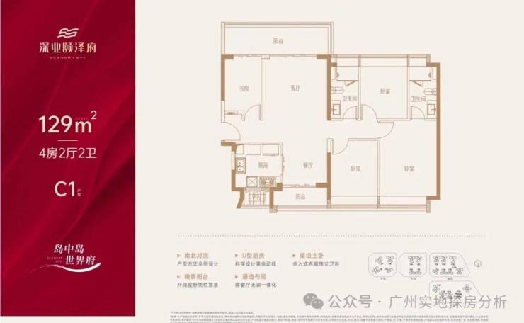 特色户型:如129平方米的“王牌四房”采用南北双阳台设计、客餐厅一体化布局,190平方米的户型则配备双主套卧室,功能分区更精细。