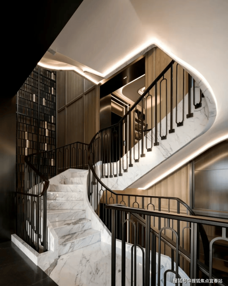 从6.6米挑高的背景墙,到每层空间的阶梯,一砖一墙,皆采用天然大理石,加上人工精细打磨而成。山顶空间里,每一种纹理图案都是独一无二的,点缀出别具一格的美感,把“定制感”做到了极致。